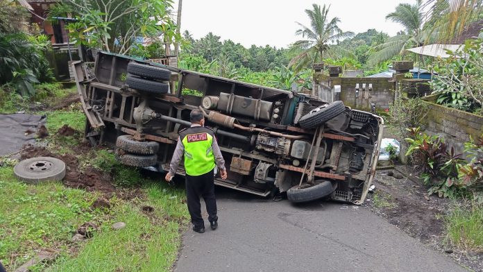 Tabanan, BaliUpdate.id – OC ( Out Of Control ) kendaraan Truck Isusu memuat pakan Ayam 6,5 Ton di kemudikan IGEP (inisial) asal Denpasar terguling, Senin,(3/1) jam 10.30 di jalan jurusan Gadungan, Desa Dalang tepatnya di Banjar Dinas Gadungan Pondok Kaja, Desa Gadungan, Selemadeg Timur, Tabanan.